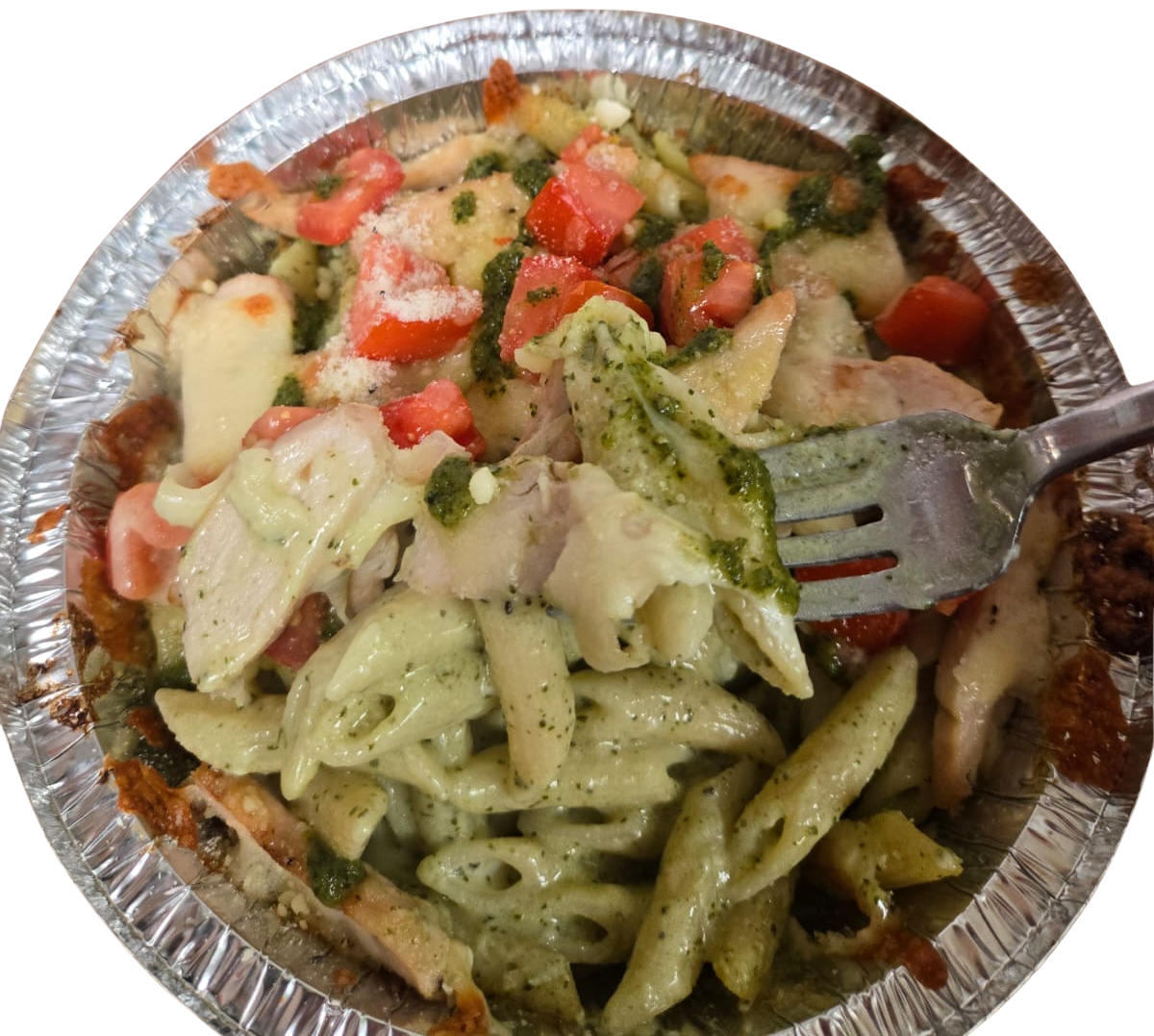 Starting with fresh penne rigate pasta tossed in our house Alfredo sauce and pesto puree. We add our house-roasted chicken breast, mozzarella cheese, roasted garlic, topped with asiago-parmesan flakes and tomatoes. (Make it vegetarian by subbing the chicken for cauliflower)